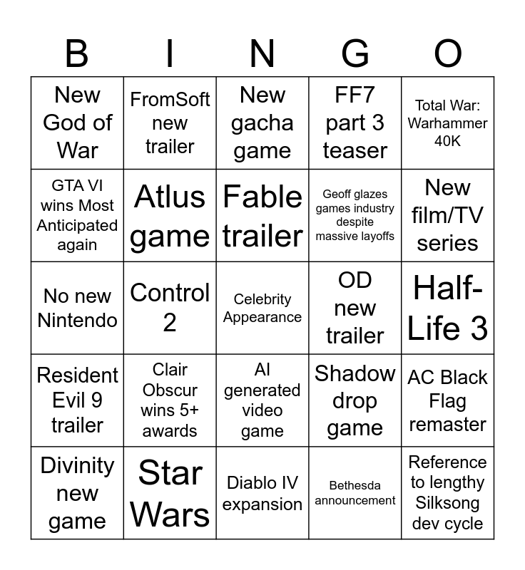 This bingo card has a free space and 24 words: Clair Obscur wins 5+ awards, Star Wars, Fable trailer, Divinity new game, Total War: Warhammer 40K, New God of War, GTA VI wins Most Anticipated again, FromSoft new trailer, OD new trailer, AI generated video game, Geoff glazes games industry despite massive layoffs, No new Nintendo, Shadow drop game, AC Black Flag remaster, Atlus game, Bethesda announcement, Half-Life 3, New gacha game, New film/TV series, Control 2, Reference to lengthy Silksong dev cycle, Resident Evil 9 trailer, FF7 part 3 teaser and Diablo IV expansion.