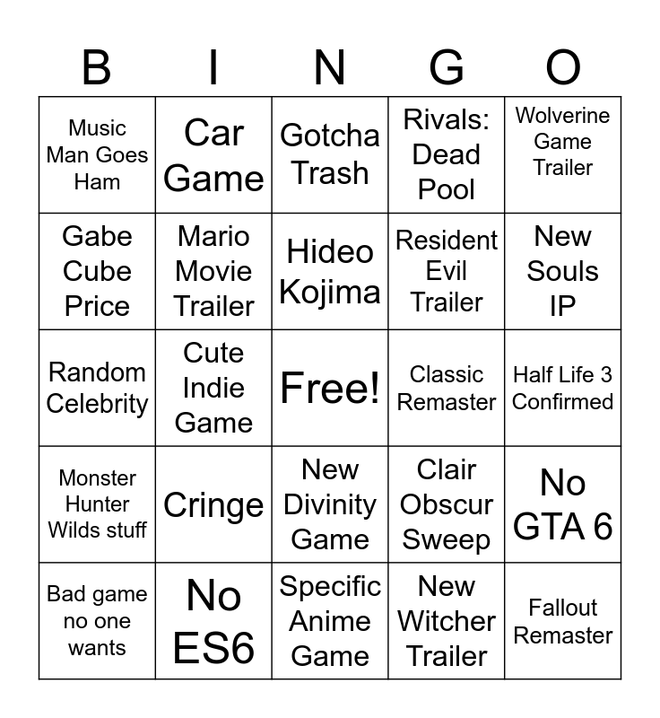 This bingo card has a free space and 24 words: Cringe, No ES6, Hideo Kojima, Bad game no one wants, Wolverine Game Trailer, Music Man Goes Ham, Gabe Cube Price, Car Game, Classic Remaster, New Divinity Game, Resident Evil Trailer, Random Celebrity, Clair Obscur Sweep, No GTA 6, Mario Movie Trailer, New Witcher Trailer, Half Life 3 Confirmed, Gotcha Trash, New Souls IP, Cute Indie Game, Fallout Remaster, Monster Hunter Wilds stuff, Rivals: Dead Pool and Specific Anime Game.