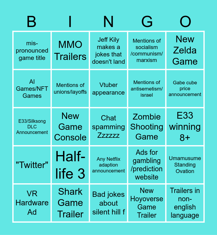 This bingo card has a free space and 24 words: Half-life 3, Shark Game Trailer, Vtuber appearance, VR Hardware Ad, New Zelda Game, mis-pronounced game title, AI Games/NFT Games, MMO Trailers, Zombie Shooting Game, Any Netflix adaption announcement, Mentions of antisemetism/ israel, E33/Silksong DLC Announcement, Ads for gambling /prediction website, Umamusume Standing Ovation, Mentions of unions/layoffs, New Hoyoverse Game Trailer, E33 winning 8+, Jeff Kily makes a jokes that doesn't land, Gabe cube price announcement, New Game Console, Trailers in non-english language, "Twitter", Mentions of socialism /communism/ marxism and Bad jokes about silent hill f.