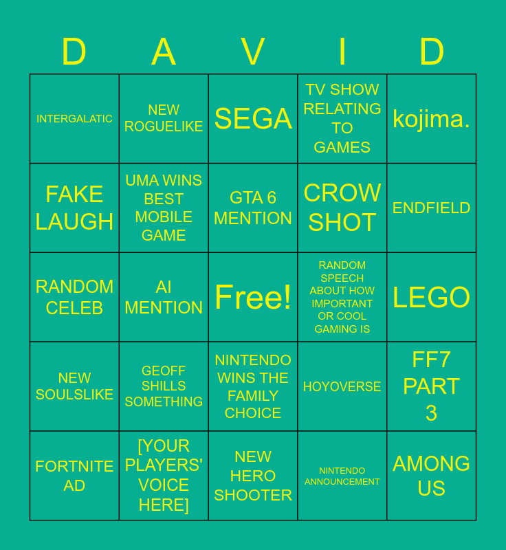 This bingo card has a free space and 40 words: TRAILER W/ NO GAMEPLAY, RANDOM CELEB, NEW ANIME GAME, UMA WINS BEST MOBILE GAME, [YOUR PLAYERS' VOICE HERE], NINTENDO WINS THE FAMILY CHOICE, GTA 6 MENTION, HALF LIFE 3, kojima., NEW SOULSLIKE, AI MENTION, TV SHOW RELATING TO GAMES, AMONG US, LEGO, RANDOM SPEECH ABOUT HOW IMPORTANT OR COOL GAMING IS, GEOFF SHILLS SOMETHING, DLC ANNOUNCEMENT, INTERGALATIC, LAYOFFS, SEGA, FF7 PART 3, NINTENDO ANNOUNCEMENT, CROW SHOT, FAKE LAUGH, AWARD NO SPEECH, MISPRONOUCATION, VIDEO CALL, JOSEF FARES, MARVEL MENTION, A NEW REMAKE, UNREAL ENGINE, FORTNITE AD, FLUTE GUY, HOYOVERSE, ENDFIELD, NEW HERO SHOOTER, NEW SONY GAME, MONSTER HUNTER, NEW ROGUELIKE and AN ACTUAL REAL SURPRISE.