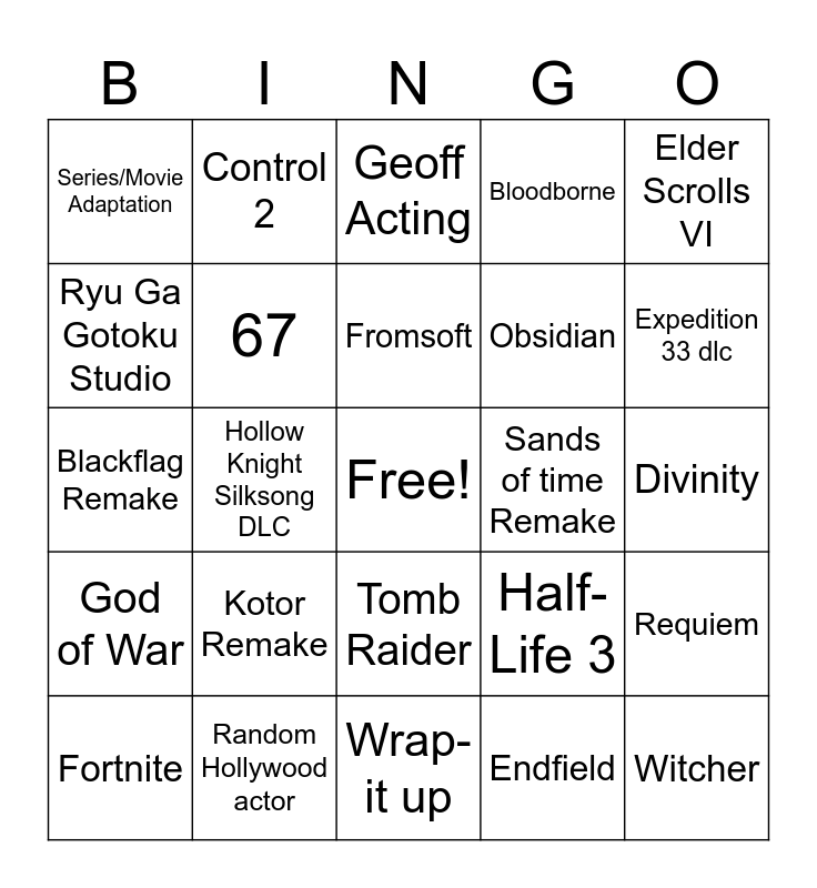 This bingo card has a free space and 24 words: Kotor Remake, Random Hollywood actor, Fromsoft, Fortnite, Elder Scrolls VI, Series/Movie Adaptation, Ryu Ga Gotoku Studio, Control 2, Sands of time Remake, Tomb Raider, Obsidian, Blackflag Remake, Half-Life 3, Requiem, 67, Endfield, Divinity, Geoff Acting, Expedition 33 dlc, Hollow Knight Silksong DLC, Witcher, God of War, Bloodborne and Wrap-it up.