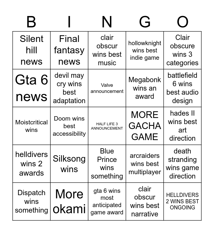 This bingo card has a free space and 24 words: Silksong wins, More okami, Valve announcement, Dispatch wins something, Clair obscure wins 3 categories, Silent hill news, Gta 6 news, Final fantasy news, MORE GACHA GAME, Blue Prince wins something, Megabonk wins an award, Moistcritical wins, arcraiders wins best multiplayer, death stranding wins game direction, devil may cry wins best adaptation, clair obscur wins best narrative, hades II wins best art direction, clair obscur wins best music, battlefield 6 wins best audio design, Doom wins best accessibility, HELLDIVERS 2 WINS BEST ONGOING, helldivers wins 2 awards, hollowknight wins best indie game and gta 6 wins most anticipated game award.