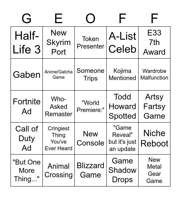 This bingo card has a free space and 24 words: Cringiest Thing You've Ever Heard, Animal Crossing, Someone Trips, "But One More Thing...", E33 7th Award, Half-Life 3, Gaben, New Skyrim Port, Todd Howard Spotted, New Console, Kojima Mentioned, Fortnite Ad, "Game Reveal" but it's just an update, Niche Reboot, Anime/Gatcha Game, Game Shadow Drops, Artsy Fartsy Game, Token Presenter, Wardrobe Malfunction, Who-Asked Remaster, New Metal Gear Game, Call of Duty Ad, A-List Celeb and Blizzard Game.