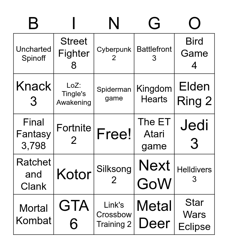 This bingo card has a free space and 24 words: Kotor, GTA 6, Spiderman game, Mortal Kombat, Bird Game 4, Uncharted Spinoff, Knack 3, Street Fighter 8, The ET Atari game, Silksong 2, Kingdom Hearts, Final Fantasy 3,798, Next GoW, Helldivers 3, LoZ: Tingle's Awakening, Metal Deer, Jedi 3, Cyberpunk 2, Elden Ring 2, Fortnite 2, Star Wars Eclipse, Ratchet and Clank, Battlefront 3 and Link's Crossbow Training 2.