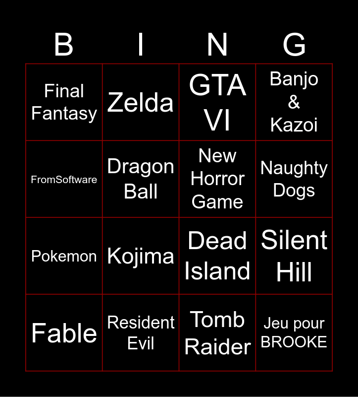 This bingo card has 16 words: Resident Evil, Silent Hill, GTA VI, Final Fantasy, Pokemon, Zelda, Dead Island, Tomb Raider, FromSoftware, Dragon Ball, Fable, Banjo & Kazoi, Kojima, Naughty Dogs, New Horror Game and Jeu pour BROOKE.