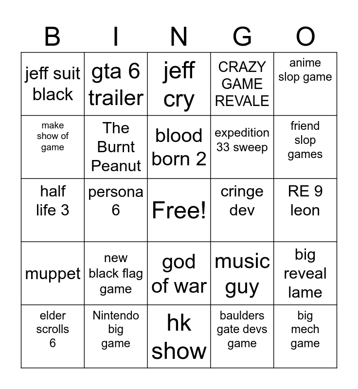 This bingo card has a free space and 24 words: new black flag game, Nintendo big game, blood born 2, elder scrolls 6, anime slop game, jeff suit black, make show of game, gta 6 trailer, cringe dev, god of war, expedition 33 sweep, half life 3, music guy, big reveal lame, The Burnt Peanut, baulders gate devs game, RE 9 leon, jeff cry, friend slop games, persona 6, big mech game, muppet, CRAZY GAME REVALE and hk show.