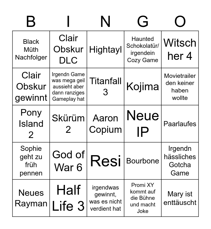 This bingo card has a free space and 24 words: God of War 6, Half Life 3, Titanfall 3, Neues Rayman, Witsch her 4, Black Müth Nachfolger, Clair Obskur gewinnt, Clair Obskur DLC, Neue IP, Resi, Kojima, Pony Island 2, Bourbone, Irgendn hässliches Gotcha Game, Irgendn Game was mega geil aussieht aber dann ranziges Gameplay hat, Promi XY kommt auf die Bühne und macht Joke, Paarlaufes, Hightayl, Movietrailer den keiner haben wollte, Skürüm 2, Mary ist enttäuscht, Sophie geht zu früh pennen, Haunted Schokolatür/ irgendein Cozy Game and irgendwas gewinnt, was es nicht verdient hat.