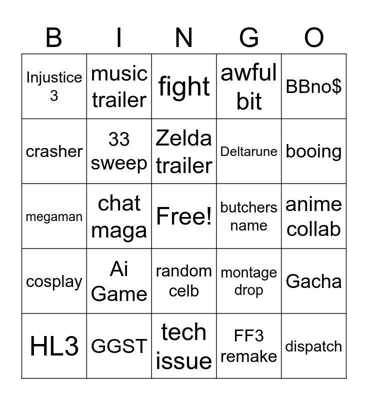 This bingo card has a free space and 24 words: Ai Game, GGST, Zelda trailer, HL3, BBno$, Injustice 3, crasher, music trailer, butchers name, random celb, Deltarune, megaman, montage drop, Gacha, 33 sweep, FF3 remake, anime collab, fight, booing, chat maga, dispatch, cosplay, awful bit and tech issue.