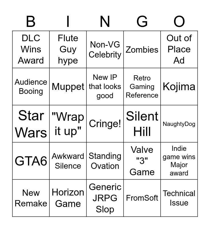 This bingo card has a free space and 24 words: Awkward Silence, Horizon Game, New IP that looks good, New Remake, Out of Place Ad, DLC Wins Award, Audience Booing, Flute Guy hype, Silent Hill, Standing Ovation, Retro Gaming Reference, Star Wars, Valve "3" Game, Indie game wins Major award, Muppet, FromSoft, NaughtyDog, Non-VG Celebrity, Kojima, "Wrap it up", Technical Issue, GTA6, Zombies and Generic JRPG Slop.