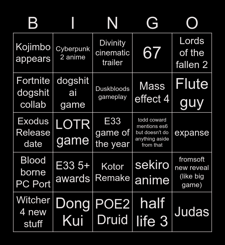 This bingo card has a free space and 24 words: E33 5+ awards, Dong Kui, Duskbloods gameplay, Witcher 4 new stuff, Lords of the fallen 2, Kojimbo appears, Fortnite dogshit collab, Cyberpunk 2 anime, todd coward mentions es6 but doesn't do anything aside from that, Kotor Remake, Mass effect 4, Exodus Release date, sekiro anime, fromsoft new reveal (like big game), dogshit ai game, half life 3, expanse, Divinity cinematic trailer, Flute guy, LOTR game, Judas, Blood borne PC Port, 67 and POE2 Druid.