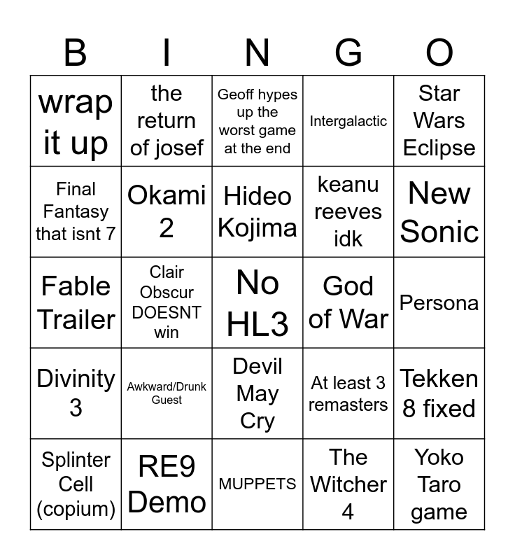 This bingo card has a free space and 24 words: Awkward/Drunk Guest, RE9 Demo, Hideo Kojima, Splinter Cell (copium), Star Wars Eclipse, wrap it up, Final Fantasy that isnt 7, the return of josef, God of War, Devil May Cry, keanu reeves idk, Fable Trailer, At least 3 remasters, Tekken 8 fixed, Okami 2, The Witcher 4, Persona, Geoff hypes up the worst game at the end, New Sonic, Clair Obscur DOESNT win, Yoko Taro game, Divinity 3, Intergalactic and MUPPETS.