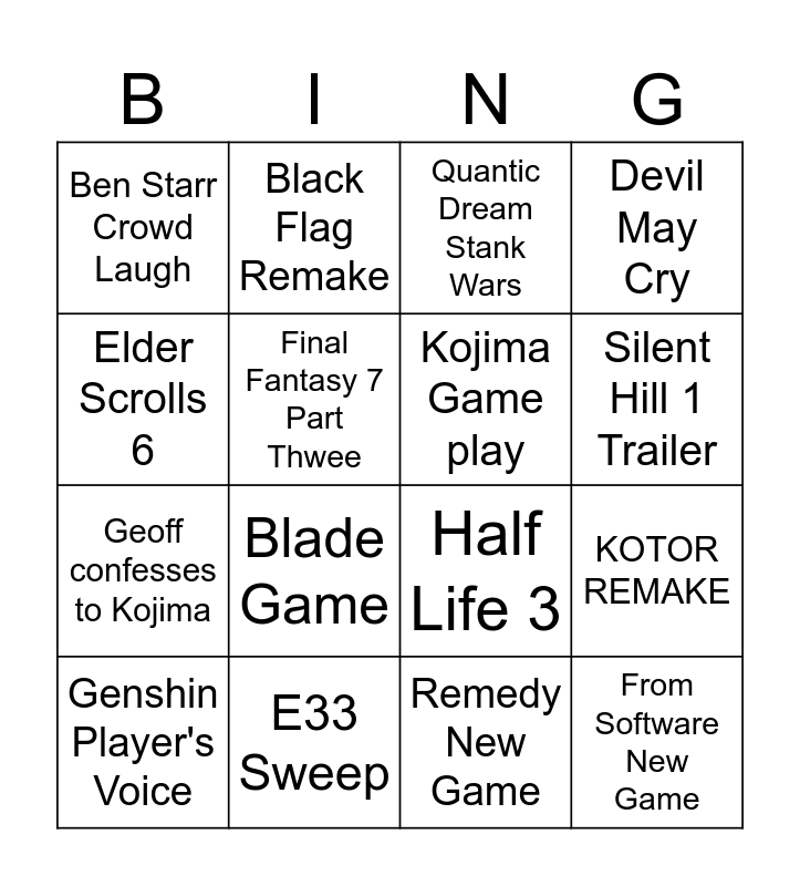 This bingo card has 16 words: E33 Sweep, KOTOR REMAKE, Quantic Dream Stank Wars, Ben Starr Crowd Laugh, Geoff confesses to Kojima, Black Flag Remake, Half Life 3, Remedy New Game, Elder Scrolls 6, Final Fantasy 7 Part Thwee, Genshin Player's Voice, Devil May Cry, Blade Game, Silent Hill 1 Trailer, Kojima Game play and From Software New Game.