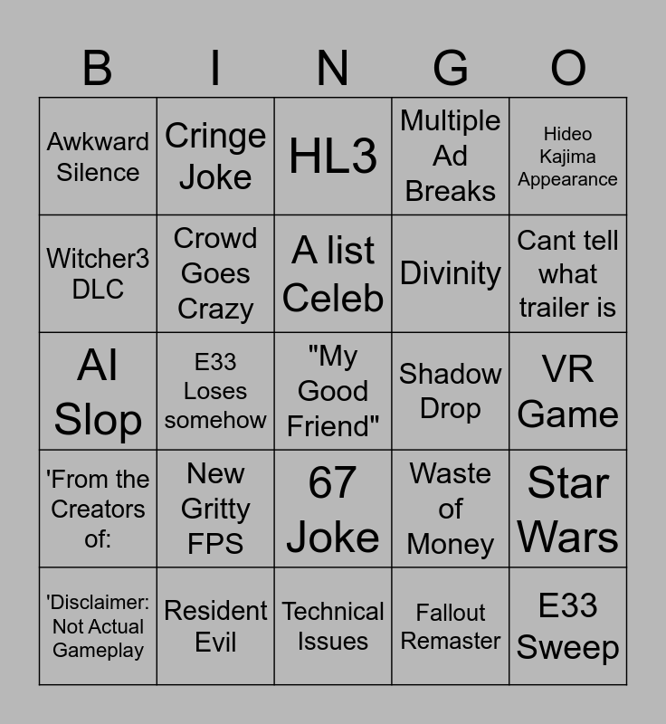 This bingo card has a free space and 26 words: 67 Joke, Fallout Remaster, A list Celeb, Resident Evil, Hideo Kajima Appearance, Awkward Silence, Witcher3 DLC, Cringe Joke, VR Game, Waste of Money, Divinity, AI Slop, Star Wars, 'Disclaimer: Not Actual Gameplay, E33 Loses somehow, Bloodborn, Multiple Ad Breaks, 'From the Creators of:, HL3, E33 Sweep, Cant tell what trailer is, Technical Issues, Shadow Drop, New Gritty FPS, Crowd Goes Crazy and Disappointing.