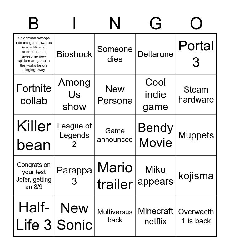 This bingo card has a free space and 24 words: Parappa 3, New Sonic, New Persona, Half-Life 3, Portal 3, Spiderman swoops into the game awards in real life and announces an awesome new spiderman game in the works before slinging away, Fortnite collab, Bioshock, Bendy Movie, Mario trailer, Cool indie game, Killer bean, Miku appears, kojisma, Among Us show, Minecraft netflix, Muppets, Someone dies, Steam hardware, League of Legends 2, Overwacth 1 is back, Congrats on your test Jofer, getting an 8/9, Deltarune and Multiversus back.