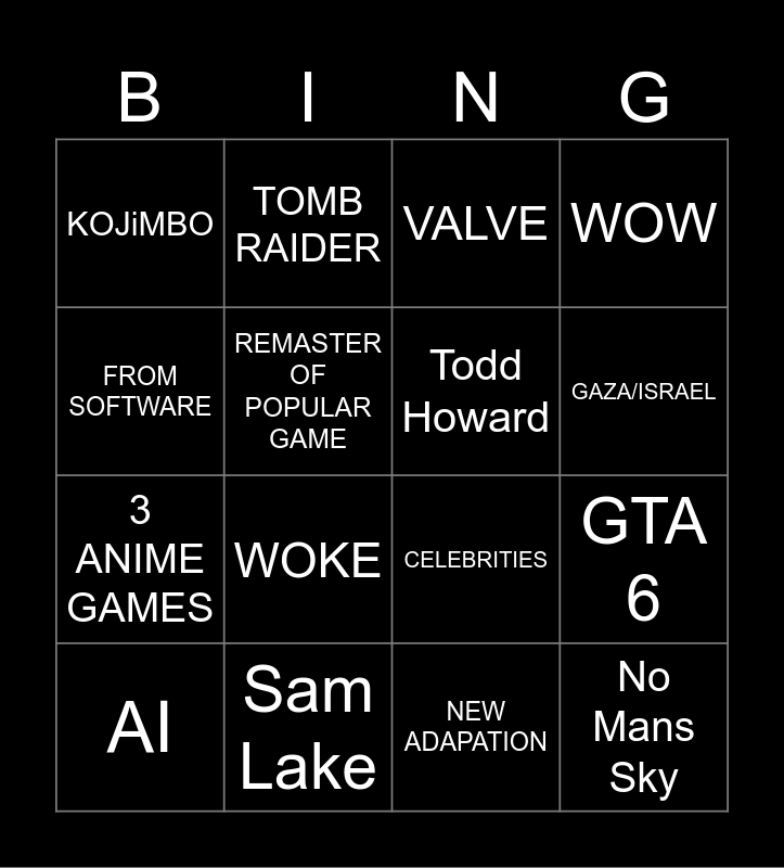 This bingo card has 16 words: Sam Lake, GTA 6, VALVE, KOJiMBO, 3 ANIME GAMES, TOMB RAIDER, CELEBRITIES, NEW ADAPATION, FROM SOFTWARE, REMASTER OF POPULAR GAME, AI, WOW, WOKE, GAZA/ISRAEL, Todd Howard and No Mans Sky.