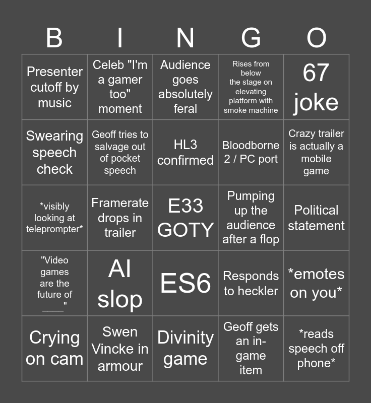 This bingo card has a free space and 24 words: AI slop, Swen Vincke in armour, HL3 confirmed, Crying on cam, 67 joke, Presenter cutoff by music, Swearing speech check, Celeb "I'm a gamer too" moment, Pumping up the audience after a flop, ES6, Bloodborne 2 / PC port, *visibly looking at teleprompter*, Responds to heckler, *emotes on you*, Geoff tries to salvage out of pocket speech, Geoff gets an in-game item, Political statement, Audience goes absolutely feral, Crazy trailer is actually a mobile game, Framerate drops in trailer, *reads speech off phone*, "Video games are the future of ____", Rises from below the stage on elevating platform with smoke machine and Divinity game.