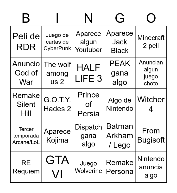 This bingo card has a free space and 24 words: Aparece Kojima, GTA VI, HALF LIFE 3, RE Requiem, Minecraft 2 peli, Peli de RDR, Anuncio God of War, Juego de cartas de CyberPunk, Algo de Nintendo, Dispatch gana algo, PEAK gana algo, Remake Silent Hill, Batman Arkham / Lego, From Bugisoft, The wolf among us 2, Remake Persona, Witcher 4, Aparece algun Youtuber, Anuncian algun juego choto, G.O.T.Y. Hades 2, Nintendo anuncia algo, Tercer temporada Arcane/LoL, Aparece Jack Black and Juego Wolverine.