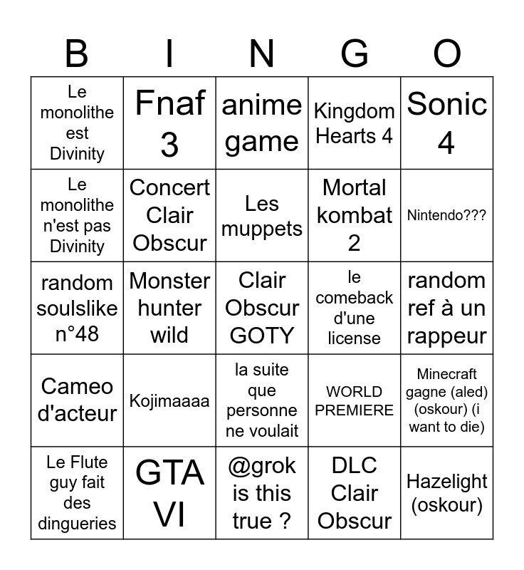 This bingo card has a free space and 24 words: Kojimaaaa, GTA VI, Les muppets, Le Flute guy fait des dingueries, Sonic 4, Le monolithe est Divinity, Le monolithe n'est pas Divinity, Fnaf 3, le comeback d'une license, la suite que personne ne voulait, Mortal kombat 2, random soulslike n°48, WORLD PREMIERE, Minecraft gagne (aled) (oskour) (i want to die), Concert Clair Obscur, DLC Clair Obscur, random ref à un rappeur, anime game, Nintendo???, Monster hunter wild, Hazelight (oskour), Cameo d'acteur, Kingdom Hearts 4 and @grok is this true ?.