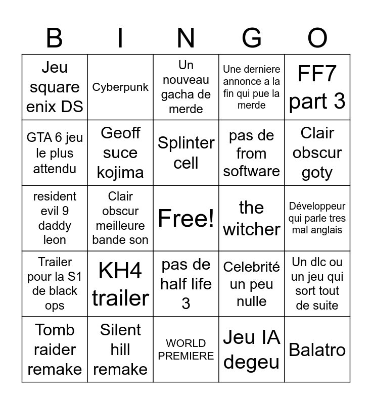This bingo card has a free space and 24 words: KH4 trailer, Silent hill remake, Splinter cell, Tomb raider remake, FF7 part 3, Jeu square enix DS, GTA 6 jeu le plus attendu, Cyberpunk, the witcher, pas de half life 3, pas de from software, resident evil 9 daddy leon, Celebrité un peu nulle, Un dlc ou un jeu qui sort tout de suite, Geoff suce kojima, Jeu IA degeu, Développeur qui parle tres mal anglais, Un nouveau gacha de merde, Clair obscur goty, Clair obscur meilleure bande son, Balatro, Trailer pour la S1 de black ops, Une derniere annonce a la fin qui pue la merde and WORLD PREMIERE.