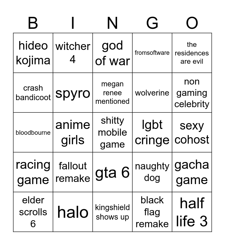 This bingo card has a free space and 24 words: fallout remake, halo, megan renee mentioned, elder scrolls 6, the residences are evil, hideo kojima, crash bandicoot, witcher 4, lgbt cringe, gta 6, wolverine, bloodbourne, naughty dog, gacha game, spyro, black flag remake, sexy cohost, god of war, non gaming celebrity, anime girls, half life 3, racing game, fromsoftware and kingshield shows up.