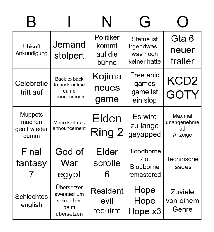 This bingo card has a free space and 24 words: God of War egypt, Übersetzer sweated um sein leben beim übersetzen, Kojima neues game, Schlechtes english, Gta 6 neuer trailer, Ubisoft Ankündigung, Celebretie tritt auf, Jemand stolpert, Es wird zu lange geyapped, Elder scrolle 6, Free epic games game ist ein slop, Muppets machen geoff wieder dumm, Bloodborne 2 o. Blodborne remastered, Technische issues, Back to back to back anime game announcement, Hope Hope Hope x3, Maximal unangenehme ad Anzeige, Politiker kommt auf die bühne, KCD2 GOTY, Mario kart döc announcement, Zuviele von einem Genre, Final fantasy 7, Statue ist irgendwas , was noch keiner hatte and Reaident evil requirm.