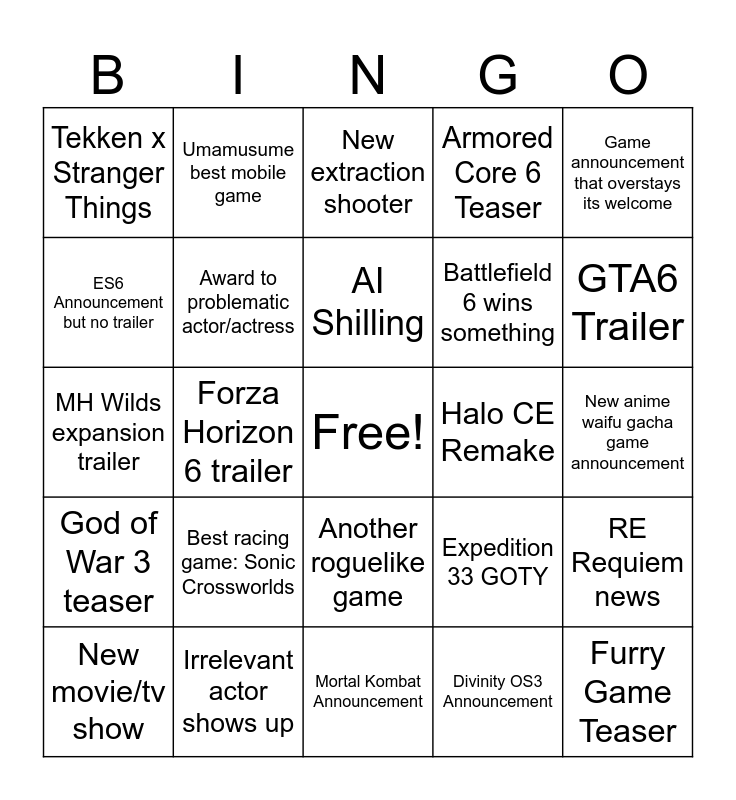 This bingo card has a free space and 24 words: Best racing game: Sonic Crossworlds, Irrelevant actor shows up, AI Shilling, New movie/tv show, Game announcement that overstays its welcome, Tekken x Stranger Things, ES6 Announcement but no trailer, Umamusume best mobile game, Halo CE Remake, Another roguelike game, Battlefield 6 wins something, MH Wilds expansion trailer, Expedition 33 GOTY, RE Requiem news, Award to problematic actor/actress, Divinity OS3 Announcement, New anime waifu gacha game announcement, New extraction shooter, GTA6 Trailer, Forza Horizon 6 trailer, Furry Game Teaser, God of War 3 teaser, Armored Core 6 Teaser and Mortal Kombat Announcement.