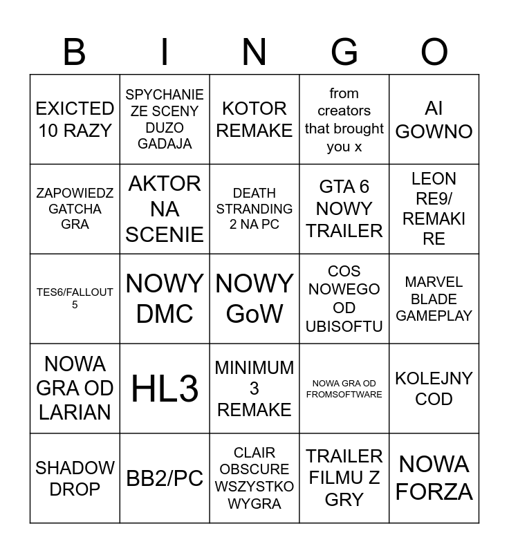 This bingo card has a free space and 24 words: HL3, BB2/PC, DEATH STRANDING 2 NA PC, SHADOW DROP, AI GOWNO, EXICTED 10 RAZY, ZAPOWIEDZ GATCHA GRA, SPYCHANIE ZE SCENY DUZO GADAJA, COS NOWEGO OD UBISOFTU, MINIMUM 3 REMAKE, GTA 6 NOWY TRAILER, TES6/FALLOUT 5, NOWA GRA OD FROMSOFTWARE, KOLEJNY COD, AKTOR NA SCENIE, TRAILER FILMU Z GRY, MARVEL BLADE GAMEPLAY, KOTOR REMAKE, LEON RE9/ REMAKI RE, NOWY DMC, NOWA FORZA, NOWA GRA OD LARIAN, from creators that brought you x and CLAIR OBSCURE WSZYSTKO WYGRA.
