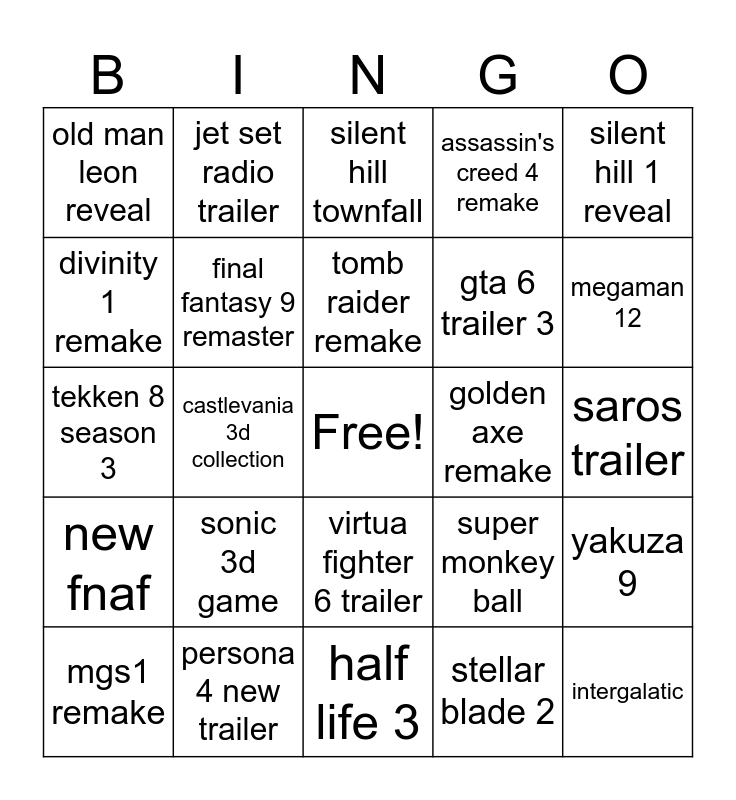 This bingo card has a free space and 24 words: sonic 3d game, persona 4 new trailer, tomb raider remake, mgs1 remake, silent hill 1 reveal, old man leon reveal, divinity 1 remake, jet set radio trailer, golden axe remake, virtua fighter 6 trailer, gta 6 trailer 3, tekken 8 season 3, super monkey ball, yakuza 9, final fantasy 9 remaster, stellar blade 2, saros trailer, silent hill townfall, megaman 12, castlevania 3d collection, intergalatic, new fnaf, assassin's creed 4 remake and half life 3.