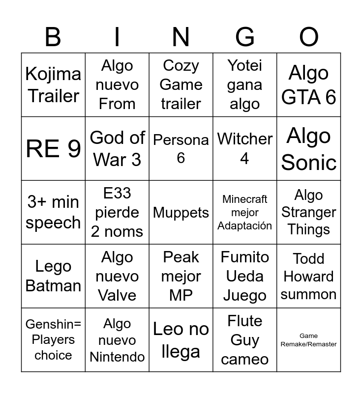 This bingo card has a free space and 24 words: Algo nuevo Valve, Algo nuevo Nintendo, Persona 6, Genshin= Players choice, Algo GTA 6, Kojima Trailer, RE 9, Algo nuevo From, Minecraft mejor Adaptación, Peak mejor MP, Witcher 4, 3+ min speech, Fumito Ueda Juego, Todd Howard summon, God of War 3, Flute Guy cameo, Algo Stranger Things, Cozy Game trailer, Algo Sonic, E33 pierde 2 noms, Game Remake/Remaster, Lego Batman, Yotei gana algo and Leo no llega.
