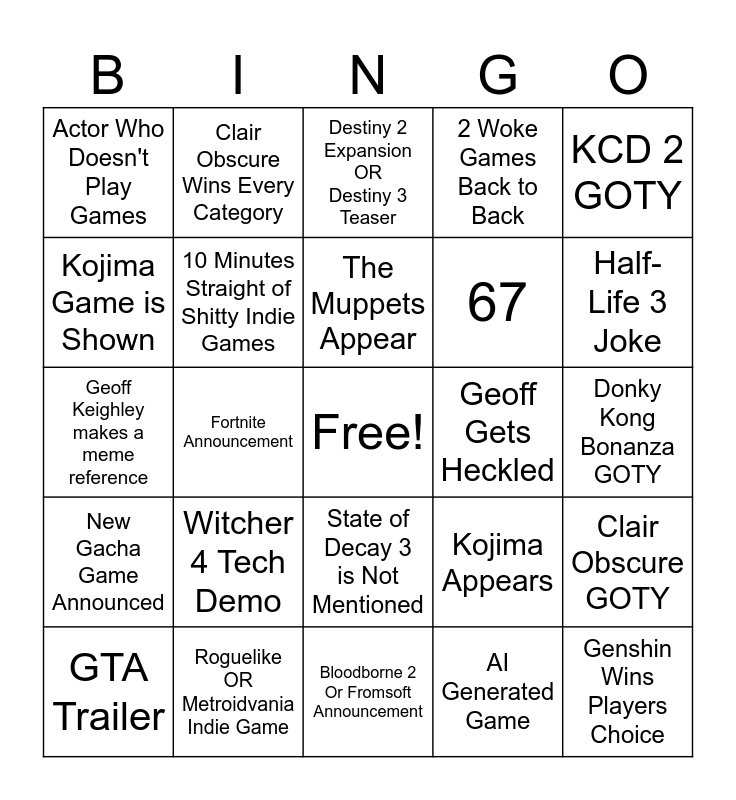 This bingo card has a free space and 24 words: Witcher 4 Tech Demo, Roguelike OR Metroidvania Indie Game, The Muppets Appear, GTA Trailer, KCD 2 GOTY, Actor Who Doesn't Play Games, Kojima Game is Shown, Clair Obscure Wins Every Category, Geoff Gets Heckled, State of Decay 3 is Not Mentioned, 67, Geoff Keighley makes a meme reference, Kojima Appears, Clair Obscure GOTY, 10 Minutes Straight of Shitty Indie Games, AI Generated Game, Donky Kong Bonanza GOTY, Destiny 2 Expansion OR Destiny 3 Teaser, Half-Life 3 Joke, Fortnite Announcement, Genshin Wins Players Choice, New Gacha Game Announced, 2 Woke Games Back to Back and Bloodborne 2 Or Fromsoft Announcement.