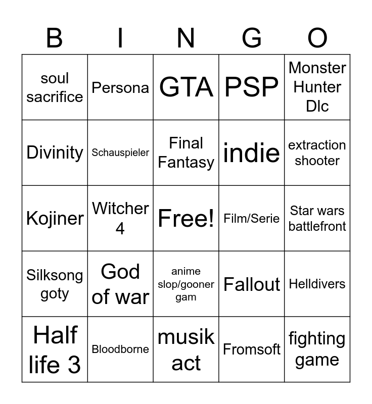 This bingo card has a free space and 24 words: God of war, Bloodborne, Final Fantasy, Half life 3, Monster Hunter Dlc, soul sacrifice, Divinity, Persona, Film/Serie, anime slop/gooner gam, indie, Kojiner, Fallout, Helldivers, Schauspieler, Fromsoft, Star wars battlefront, GTA, extraction shooter, Witcher 4, fighting game, Silksong goty, PSP and musik act.