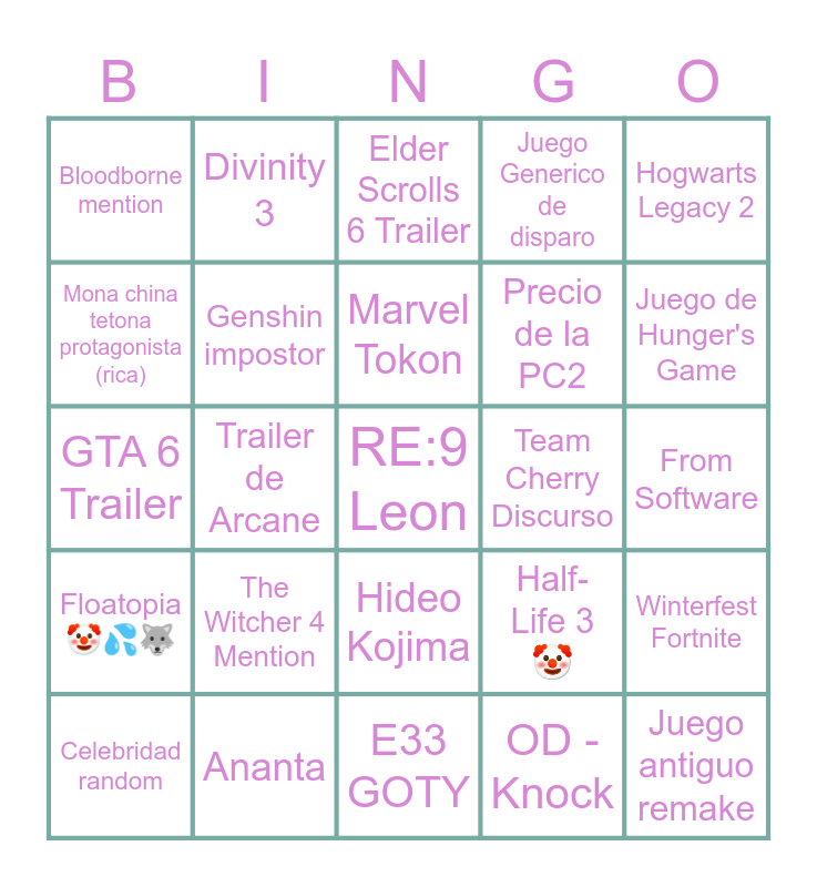 This bingo card has 25 words: Floatopia 🤡💦🐺, Ananta, RE:9 Leon, OD - Knock, Hogwarts Legacy 2, Bloodborne mention, Divinity 3, Elder Scrolls 6 Trailer, Team Cherry Discurso, Winterfest Fortnite, Mona china tetona protagonista (rica), Genshin impostor, E33 GOTY, Half-Life 3 🤡, Juego de Hunger's Game, Celebridad random, Trailer de Arcane, Marvel Tokon, Precio de la PC2, From Software, GTA 6 Trailer, The Witcher 4 Mention, Hideo Kojima, Juego Generico de disparo and Juego antiguo remake.