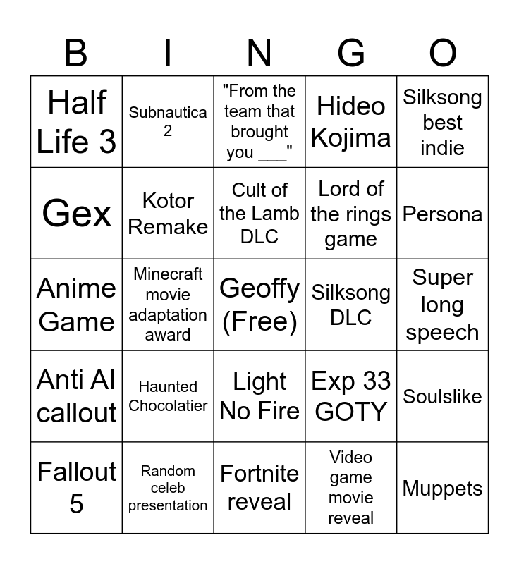This bingo card has a free space and 24 words: Fallout 5, Haunted Chocolatier, Cult of the Lamb DLC, Video game movie reveal, Silksong best indie, Half Life 3, Subnautica 2, "From the team that brought you ___", Silksong DLC, Super long speech, Anime Game, Kotor Remake, Exp 33 GOTY, Soulslike, Gex, Random celeb presentation, Fortnite reveal, Hideo Kojima, Persona, Anti AI callout, Minecraft movie adaptation award, Light No Fire, Lord of the rings game and Muppets.