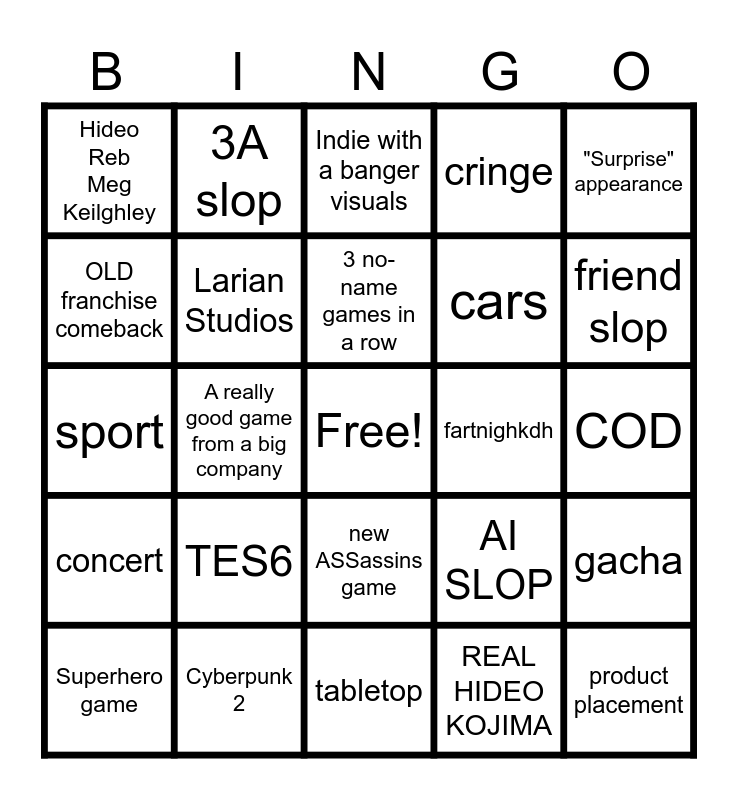 This bingo card has a free space and 24 words: TES6, Cyberpunk 2, 3 no-name games in a row, Superhero game, "Surprise" appearance, Hideo Reb Meg Keilghley, OLD franchise comeback, 3A slop, fartnighkdh, new ASSassins game, cars, sport, AI SLOP, gacha, Larian Studios, REAL HIDEO KOJIMA, COD, Indie with a banger visuals, friend slop, A really good game from a big company, product placement, concert, cringe and tabletop.