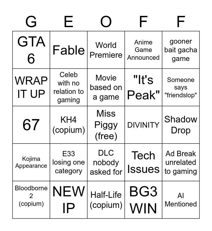 This bingo card has a free space and 24 words: E33 losing one category, NEW IP, Movie based on a game, Bloodborne 2 (copium), gooner bait gacha game, GTA 6, WRAP IT UP, Fable, DIVINITY, DLC nobody asked for, "It's Peak", 67, Tech Issues, Ad Break unrelated to gaming, Celeb with no relation to gaming, BG3 WIN, Shadow Drop, World Premiere, Someone says "friendslop", KH4 (copium), AI Mentioned, Kojima Appearance, Anime Game Announced and Half-Life (copium).