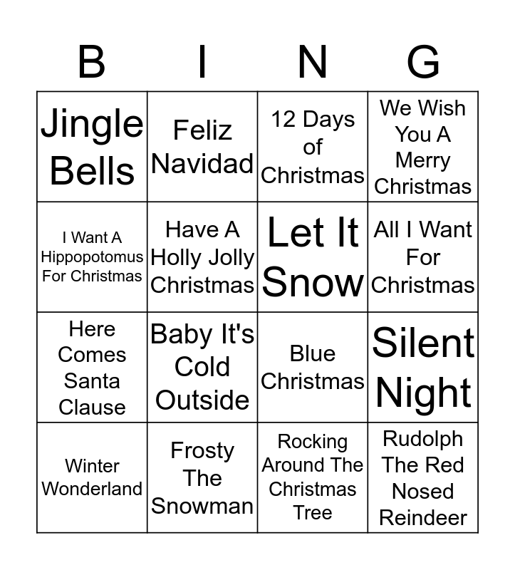 This bingo card has 16 words: Frosty The Snowman, Silent Night, 12 Days of Christmas, Jingle Bells, Here Comes Santa Clause, Feliz Navidad, Blue Christmas, Rocking Around The Christmas Tree, I Want A Hippopotomus For Christmas, Have A Holly Jolly Christmas, Winter Wonderland, We Wish You A Merry Christmas, Baby It's Cold Outside, All I Want For Christmas, Let It Snow and Rudolph The Red Nosed Reindeer.