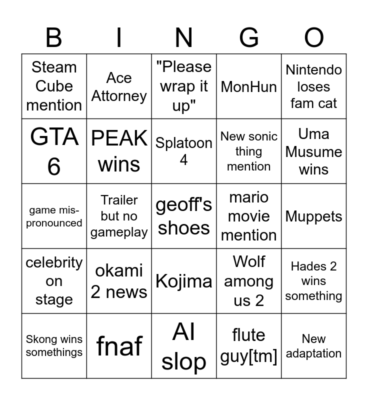 This bingo card has a free space and 24 words: okami 2 news, fnaf, Splatoon 4, Skong wins somethings, Nintendo loses fam cat, Steam Cube mention, GTA 6, Ace Attorney, mario movie mention, Kojima, New sonic thing mention, game mis-pronounced, Wolf among us 2, Hades 2 wins something, PEAK wins, flute guy[tm], Muppets, "Please wrap it up", Uma Musume wins, Trailer but no gameplay, New adaptation, celebrity on stage, MonHun and AI slop.