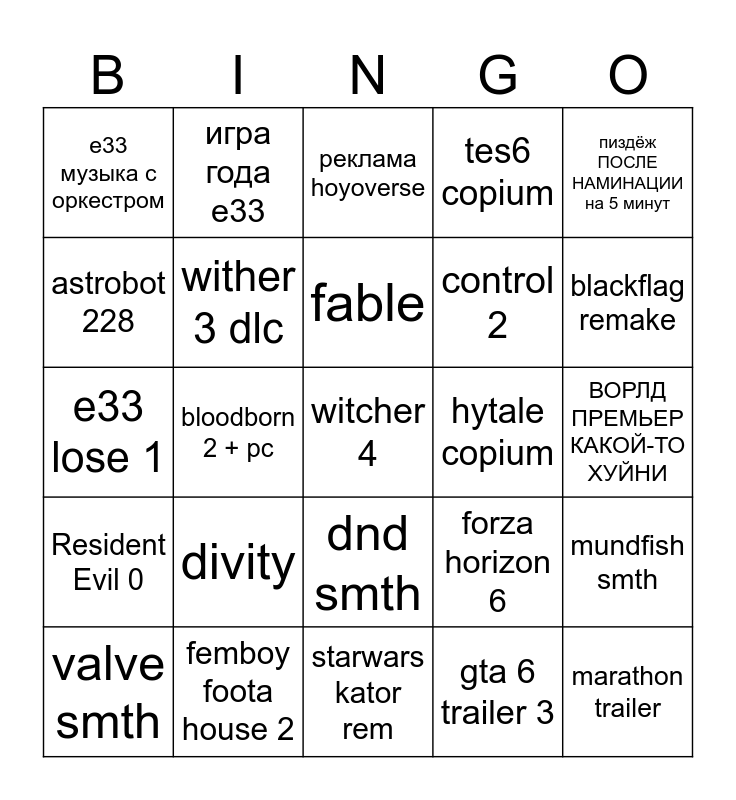 This bingo card has a free space and 24 words: valve smth, divity, fable, gta 6 trailer 3, пиздёж ПОСЛЕ НАМИНАЦИИ на 5 минут, e33 музыка с оркестром, игра года е33, реклама hoyoverse, hytale copium, ВОРЛД ПРЕМЬЕР КАКОЙ-ТО ХУЙНИ, e33 lose 1, wither 3 dlc, forza horizon 6, mundfish smth, astrobot 228, femboy foota house 2, starwars kator rem, tes6 copium, blackflag remake, Resident Evil 0, bloodborn 2 + pc, dnd smth, control 2 and marathon trailer.
