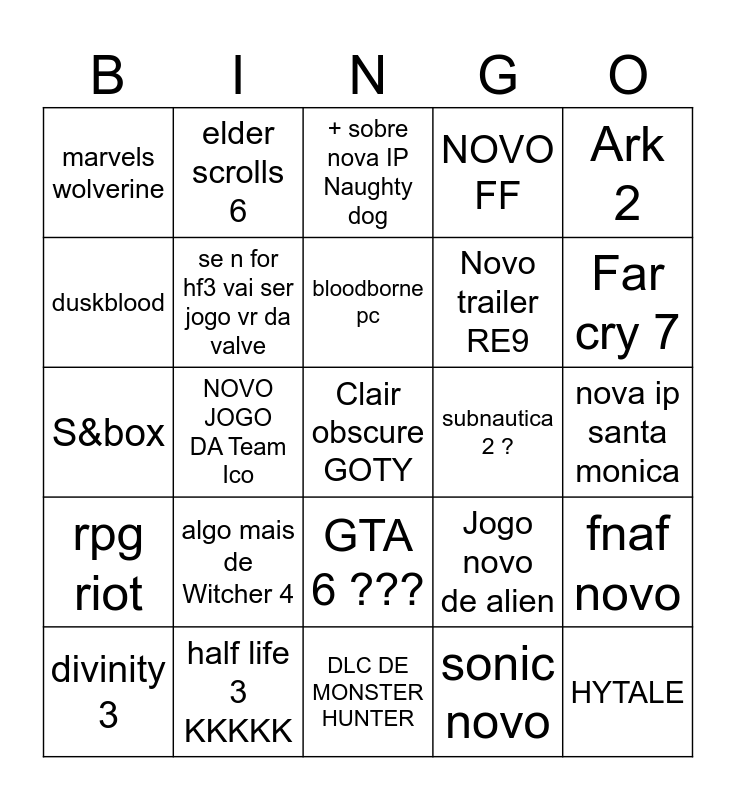 This bingo card has a free space and 24 words: algo mais de Witcher 4, half life 3 KKKKK, bloodborne pc, divinity 3, Ark 2, marvels wolverine, duskblood, elder scrolls 6, subnautica 2 ?, GTA 6 ???, Novo trailer RE9, S&box, Jogo novo de alien, fnaf novo, se n for hf3 vai ser jogo vr da valve, sonic novo, nova ip santa monica, + sobre nova IP Naughty dog, Far cry 7, NOVO JOGO DA Team Ico, HYTALE, rpg riot, NOVO FF and DLC DE MONSTER HUNTER.