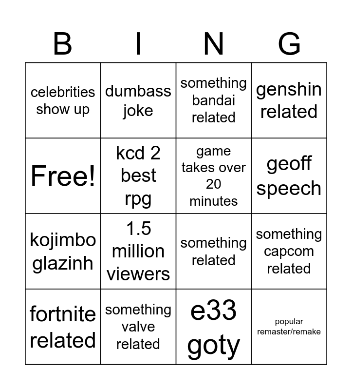 This bingo card has 16 words: something valve related, something capcom related, something bandai related, celebrities show up, kojimbo glazinh, dumbass joke, something related, e33 goty, Free!, kcd 2 best rpg, fortnite related, genshin related, 1.5 million viewers, geoff speech, game takes over 20 minutes and popular remaster/remake.