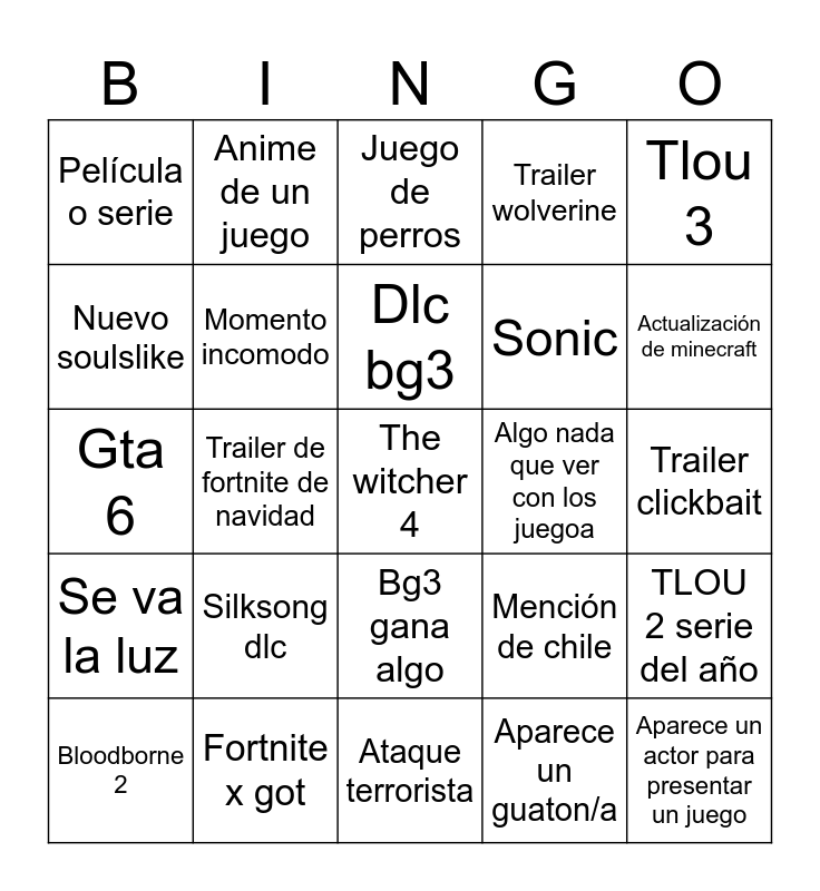 This bingo card has a free space and 24 words: Silksong dlc, Fortnite x got, Dlc bg3, Bloodborne 2, Tlou 3, Película o serie, Nuevo soulslike, Anime de un juego, Algo nada que ver con los juegoa, Bg3 gana algo, Sonic, Gta 6, Mención de chile, TLOU 2 serie del año, Momento incomodo, Aparece un guaton/a, Trailer clickbait, Juego de perros, Actualización de minecraft, Trailer de fortnite de navidad, Aparece un actor para presentar un juego, Se va la luz, Trailer wolverine and Ataque terrorista.