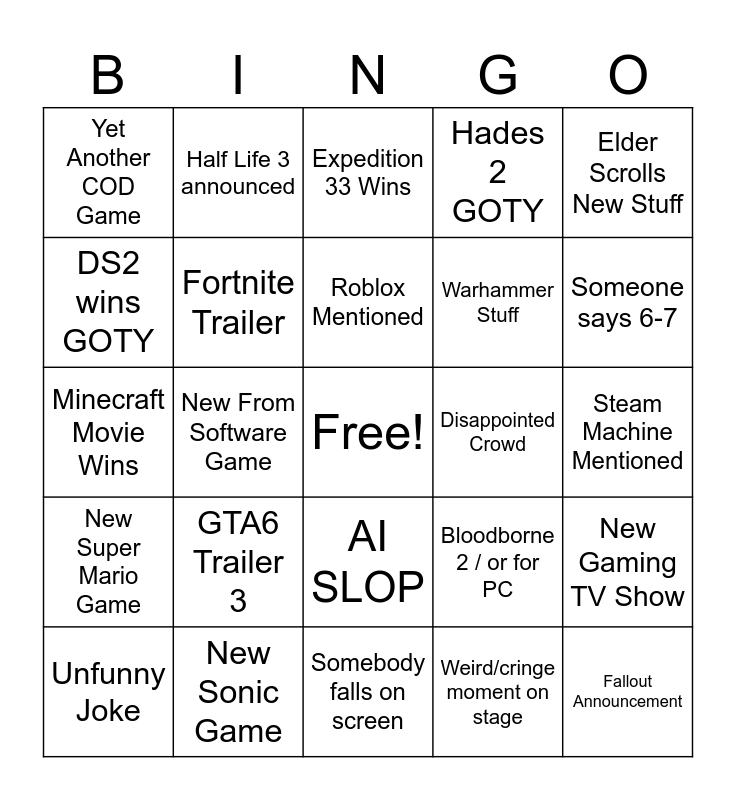 This bingo card has a free space and 24 words: GTA6 Trailer 3, New Sonic Game, Roblox Mentioned, Unfunny Joke, Elder Scrolls New Stuff, Yet Another COD Game, DS2 wins GOTY, Half Life 3 announced, Disappointed Crowd, AI SLOP, Warhammer Stuff, Minecraft Movie Wins, Bloodborne 2 / or for PC, New Gaming TV Show, Fortnite Trailer, Weird/cringe moment on stage, Steam Machine Mentioned, Expedition 33 Wins, Someone says 6-7, New From Software Game, Fallout Announcement, New Super Mario Game, Hades 2 GOTY and Somebody falls on screen.