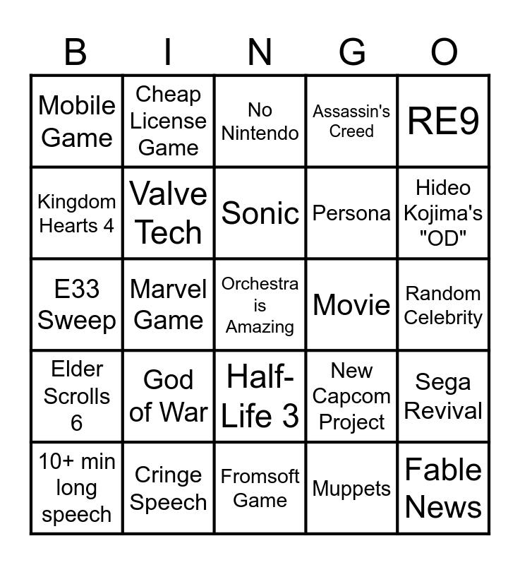 This bingo card has a free space and 24 words: God of War, Cringe Speech, Sonic, 10+ min long speech, RE9, Mobile Game, Kingdom Hearts 4, Cheap License Game, Movie, Half-Life 3, Persona, E33 Sweep, New Capcom Project, Sega Revival, Valve Tech, Muppets, Random Celebrity, No Nintendo, Hideo Kojima's "OD", Marvel Game, Fable News, Elder Scrolls 6, Assassin's Creed and Fromsoft Game.