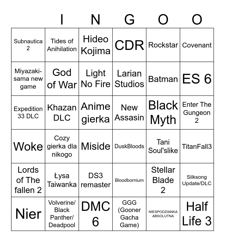 This bingo card has 36 words: Bloodbornium, DS3 remaster, GGG (Gooner Gacha Game), Miyazaki-sama new game, Woke, New Assasin, God of War, DMC 6, Rockstar, Stellar Blade 2, ES 6, CDR, Silksong Update/DLC, Khazan DLC, Larian Studios, Subnautica 2, Lords of The fallen 2, Black Myth, Expedition 33 DLC, Hideo Kojima, Anime gierka, Cozy gierka dla nikogo, DuskBloods, Miside, Tani Soul'slike, Tides of Anihilation, Batman, Volverine/ Black Panther/ Deadpool, Light No Fire, Covenant, Half Life 3, Nier, TitanFall3, Enter The Gungeon 2, Łysa Taiwanka and NIESPODZIANKA ABSOLUTNA.