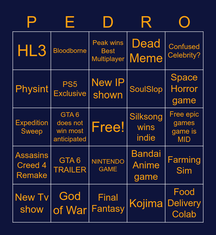 This bingo card has a free space and 24 words: GTA 6 TRAILER, God of War, New IP shown, New Tv show, Confused Celebrity?, HL3, Physint, Bloodborne, Silksong wins indie, NINTENDO GAME, SoulSlop, Expedition Sweep, Bandai Anime game, Farming Sim, PS5 Exclusive, Kojima, Free epic games game is MID, Peak wins Best Multiplayer, Space Horror game, GTA 6 does not win most anticipated, Food Delivery Colab, Assasins Creed 4 Remake, Dead Meme and Final Fantasy.