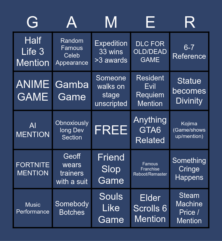 This bingo card has a free space and 24 words: Geoff wears trainers with a suit, Somebody Botches, Someone walks on stage unscripted, Music Performance, 6-7 Reference, Half Life 3 Mention, ANIME GAME, Random Famous Celeb Appearance, Anything GTA6 Related, Friend Slop Game, Resident Evil Requiem Mention, AI MENTION, Famous Franchise Reboot/Remaster, Something Cringe Happens, Gamba Game, Elder Scrolls 6 Mention, Kojima (Game/shows up/mention), Expedition 33 wins >3 awards, Statue becomes Divinity, Obnoxiously long Dev Section, Steam Machine Price / Mention, FORTNITE MENTION, DLC FOR OLD/DEAD GAME and Souls Like Game.