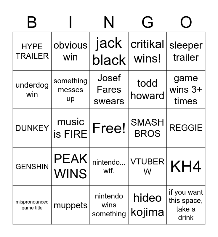 This bingo card has a free space and 24 words: PEAK WINS, muppets, Josef Fares swears, mispronounced game title, sleeper trailer, HYPE TRAILER, underdog win, obvious win, SMASH BROS, nintendo... wtf., todd howard, DUNKEY, VTUBER W, KH4, something messes up, hideo kojima, REGGIE, jack black, game wins 3+ times, music is FIRE, if you want this space, take a drink, GENSHIN, critikal wins! and nintendo wins something.