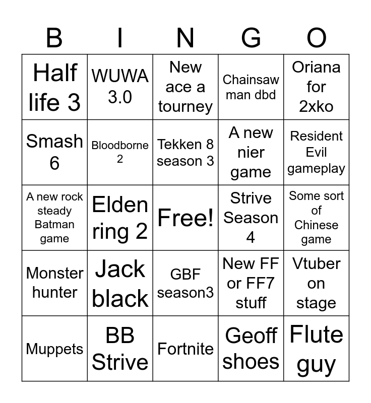 This bingo card has a free space and 24 words: Jack black, BB Strive, Tekken 8 season 3, Muppets, Oriana for 2xko, Half life 3, Smash 6, WUWA 3.0, Strive Season 4, GBF season3, A new nier game, A new rock steady Batman game, New FF or FF7 stuff, Vtuber on stage, Bloodborne 2, Geoff shoes, Some sort of Chinese game, New ace a tourney, Resident Evil gameplay, Elden ring 2, Flute guy, Monster hunter, Chainsaw man dbd and Fortnite.