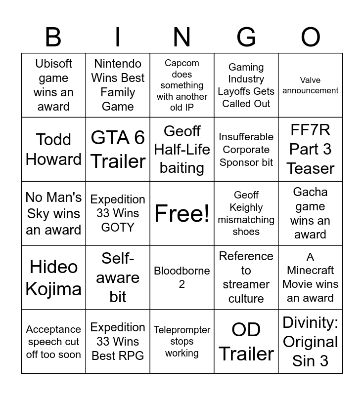 This bingo card has a free space and 24 words: Self-aware bit, Expedition 33 Wins Best RPG, Geoff Half-Life baiting, Acceptance speech cut off too soon, Valve announcement, Ubisoft game wins an award, Todd Howard, Nintendo Wins Best Family Game, Geoff Keighly mismatching shoes, Bloodborne 2, Insufferable Corporate Sponsor bit, No Man's Sky wins an award, Reference to streamer culture, A Minecraft Movie wins an award, GTA 6 Trailer, OD Trailer, Gacha game wins an award, Capcom does something with another old IP, FF7R Part 3 Teaser, Expedition 33 Wins GOTY, Divinity: Original Sin 3, Hideo Kojima, Gaming Industry Layoffs Gets Called Out and Teleprompter stops working.