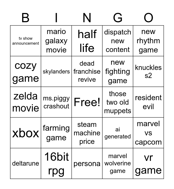 This bingo card has a free space and 24 words: farming game, 16bit rpg, dead franchise revive, deltarune, new rhythm game, tv show announcement, cozy game, mario galaxy movie, those two old muppets, steam machine price, new fighting game, zelda movie, ai generated, marvel vs capcom, skylanders, marvel wolverine game, resident evil, half life, knuckles s2, ms.piggy crashout, vr game, xbox, dispatch new content and persona.